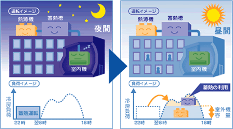 日中は氷を溶かして冷水を作り、空調冷房として使用。昼間の電力使用量を抑えられます。